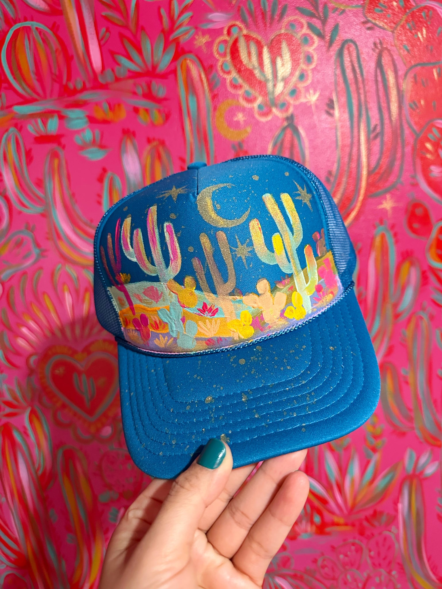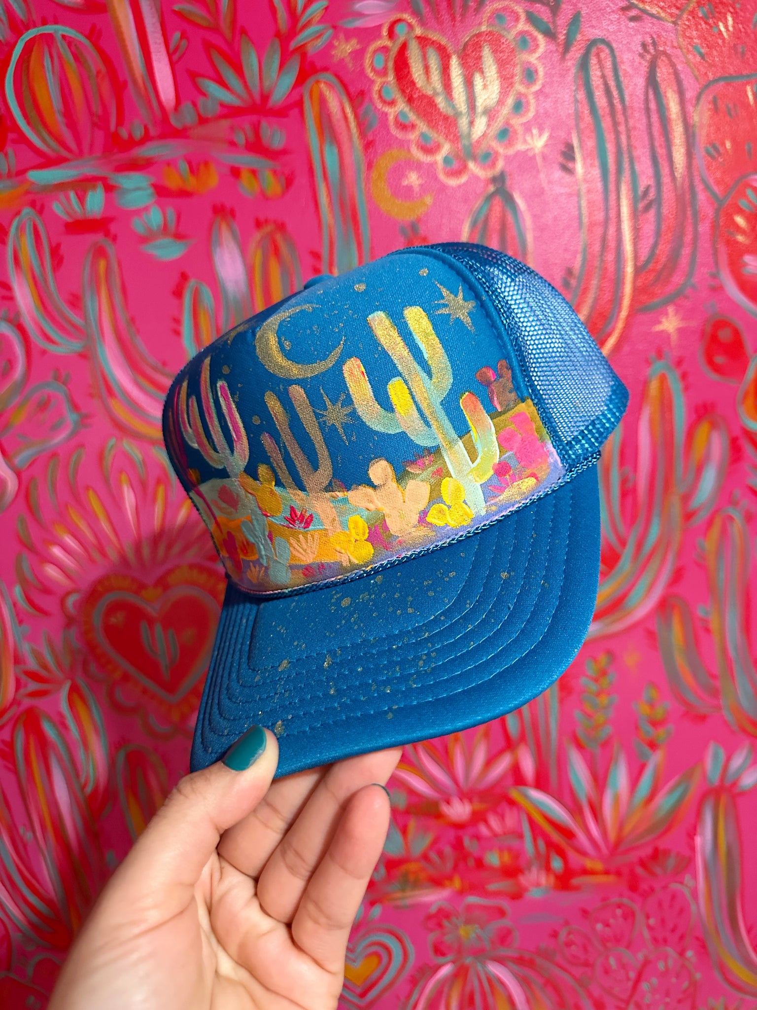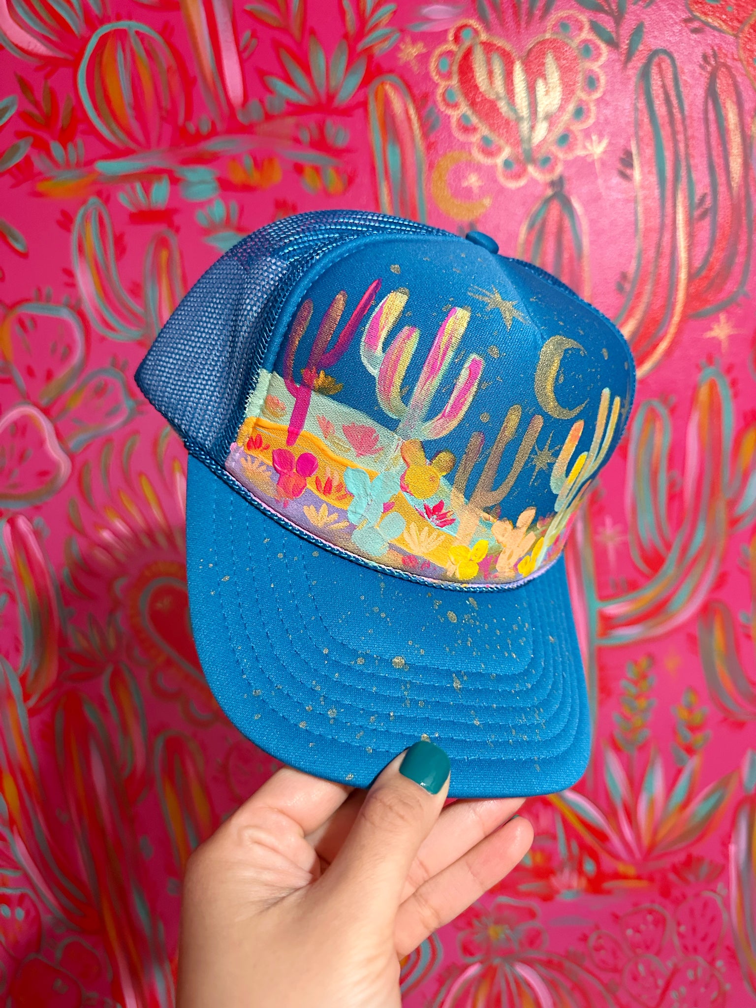 Hand painted and one of a kind, this mesh hat is designed for breathable, all day wear. The adjustable strap and universal fit make it comfortable for a variety of head sizes