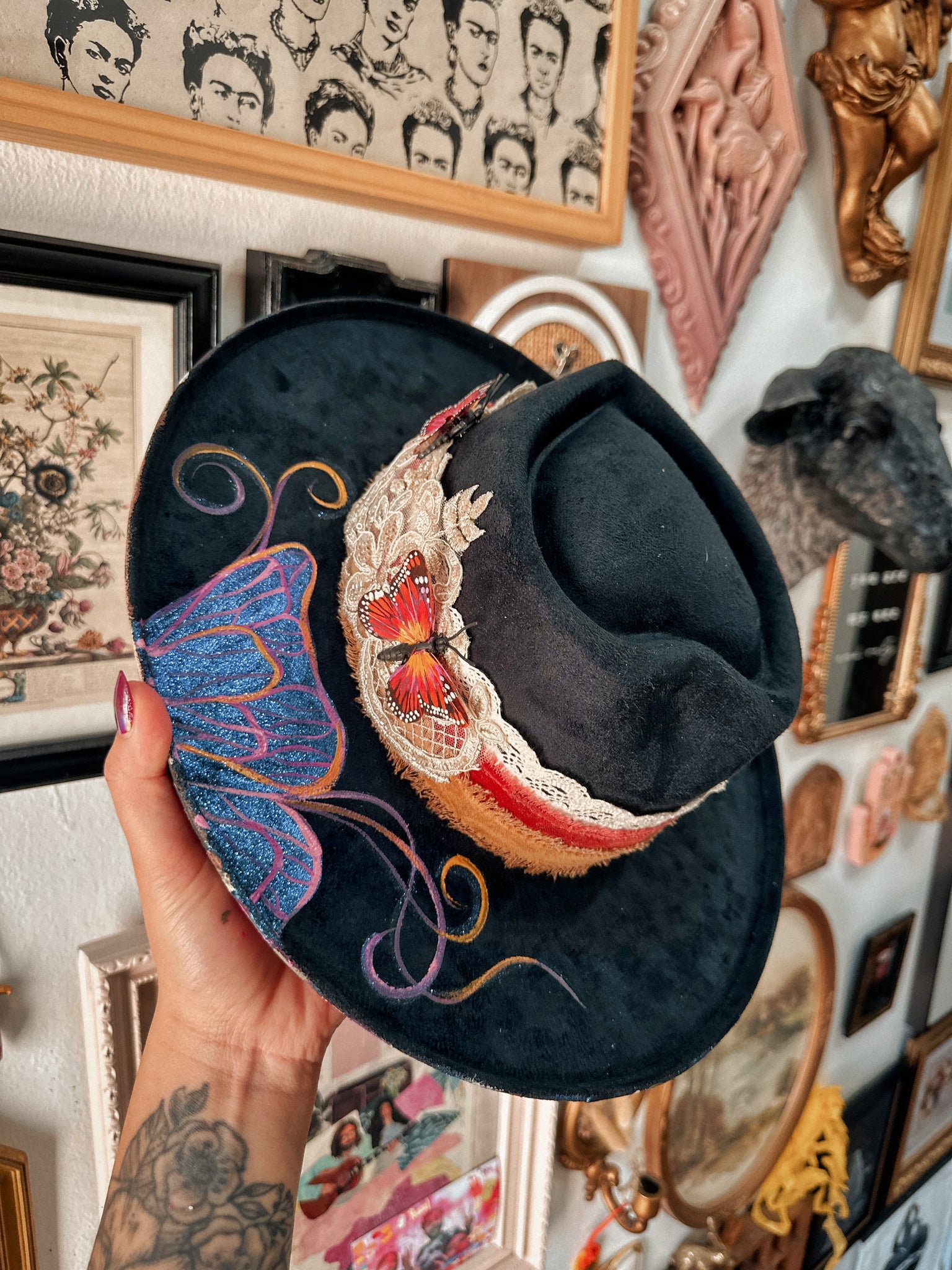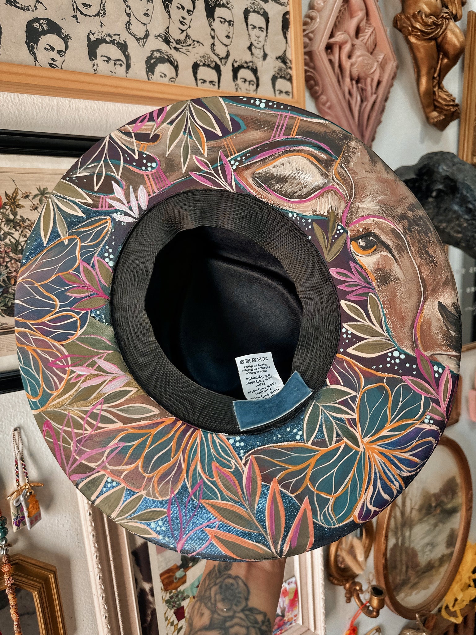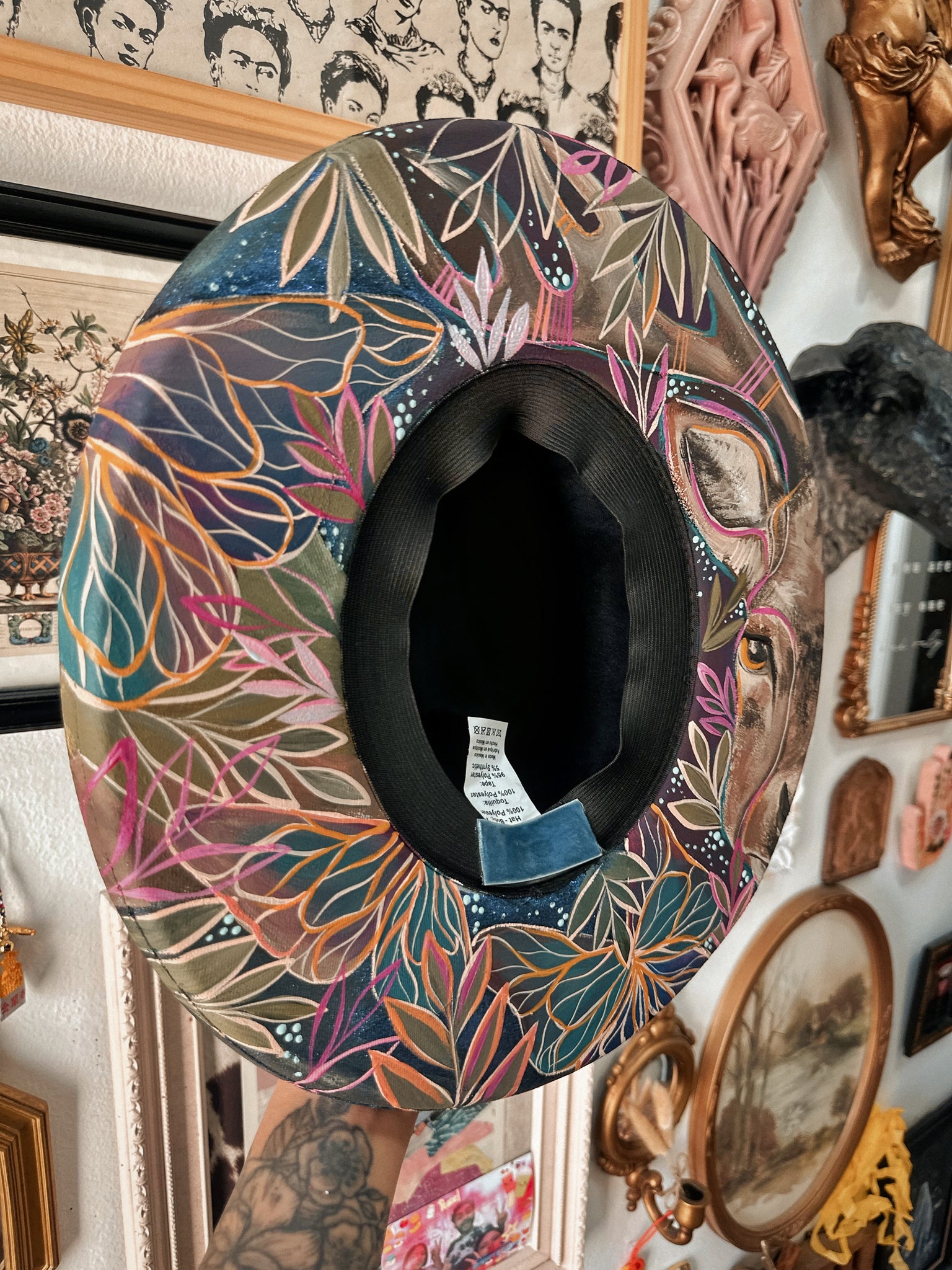 A completely freehand 1 of 1 — hand painted by Yaya in Kansas City and hand crafted hat by skilled artisans.