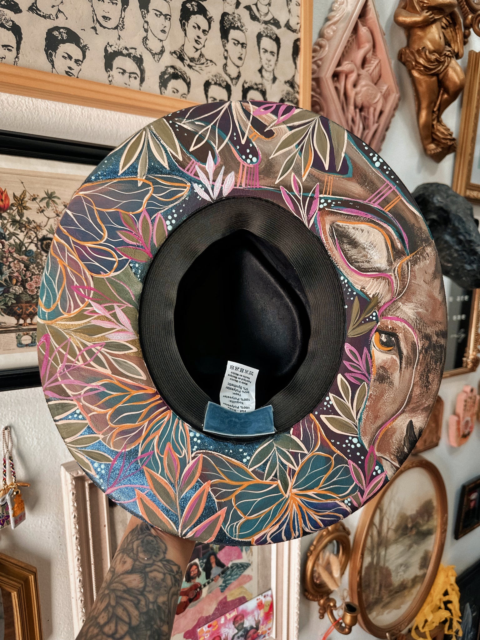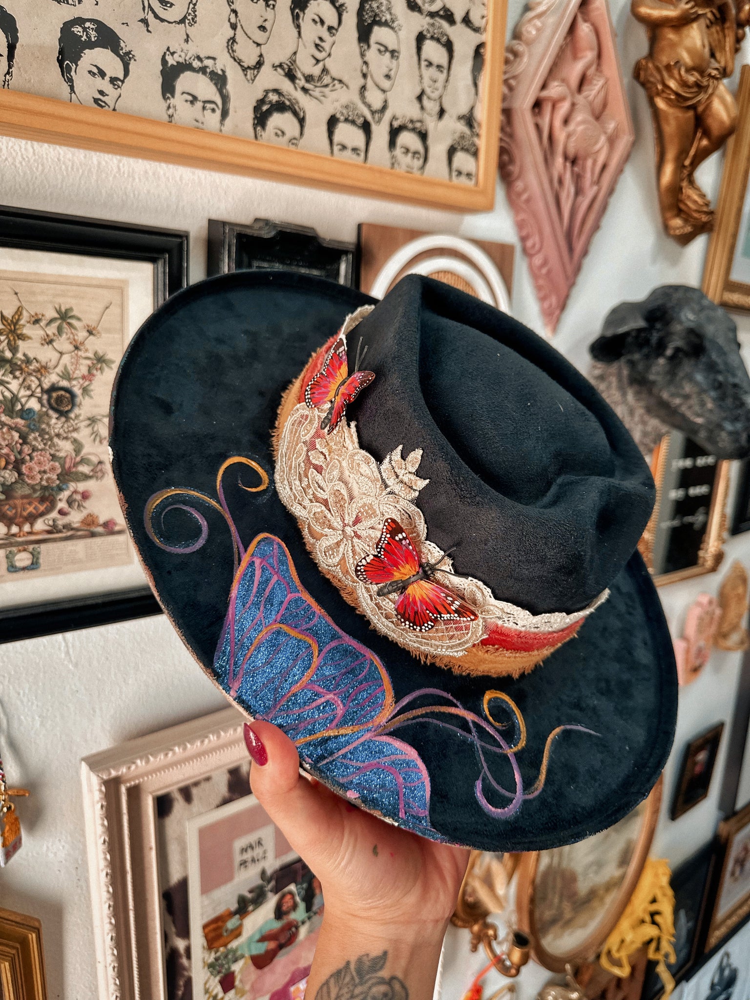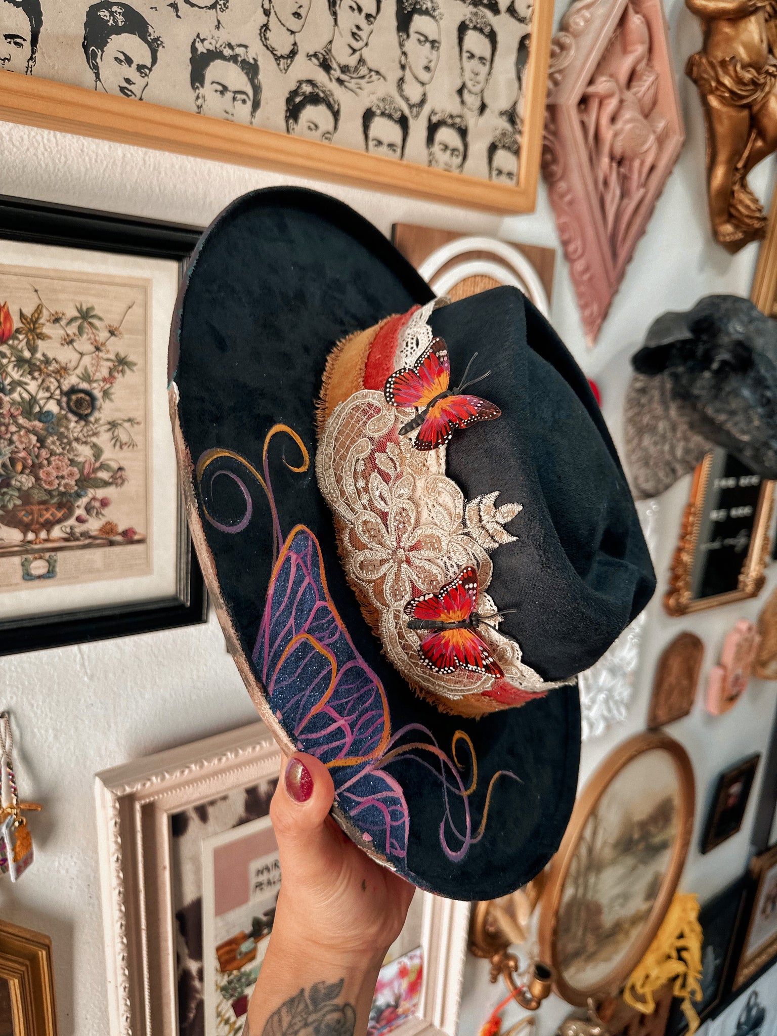 A completely freehand 1 of 1 — hand painted by Yaya in Kansas City and hand crafted hat by skilled artisans.