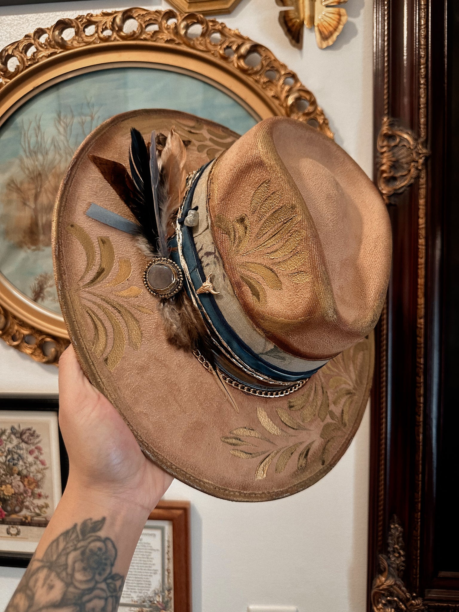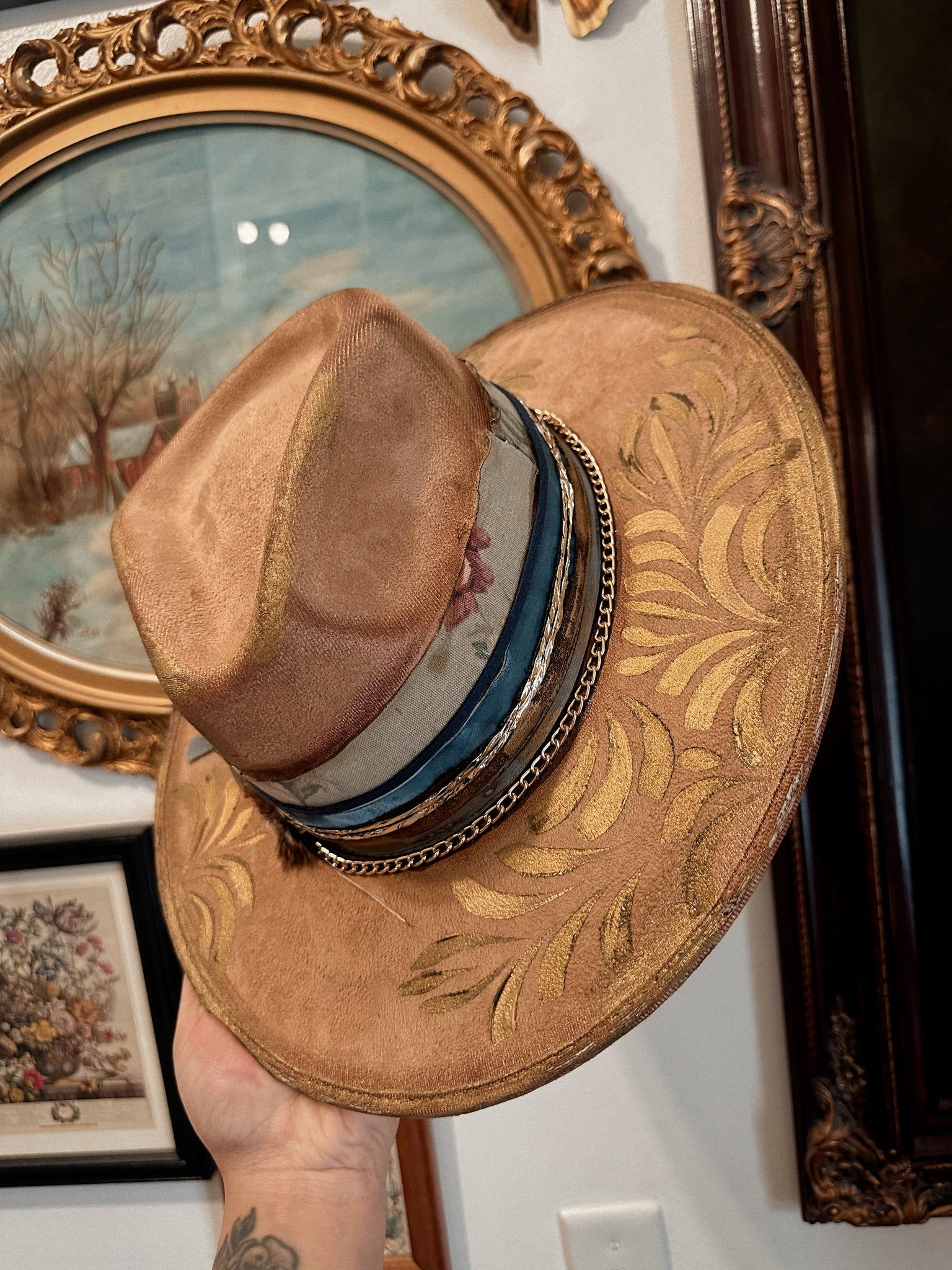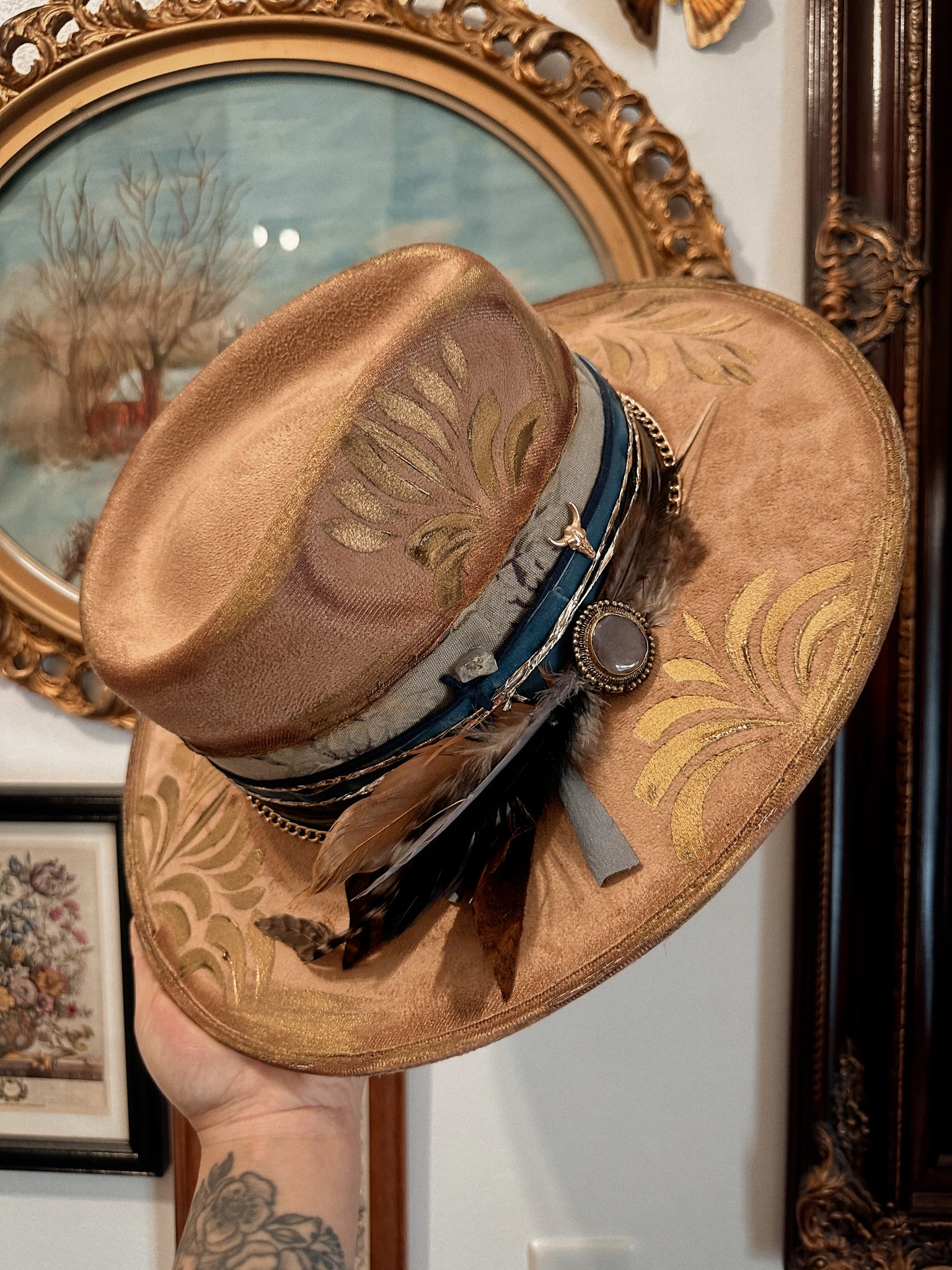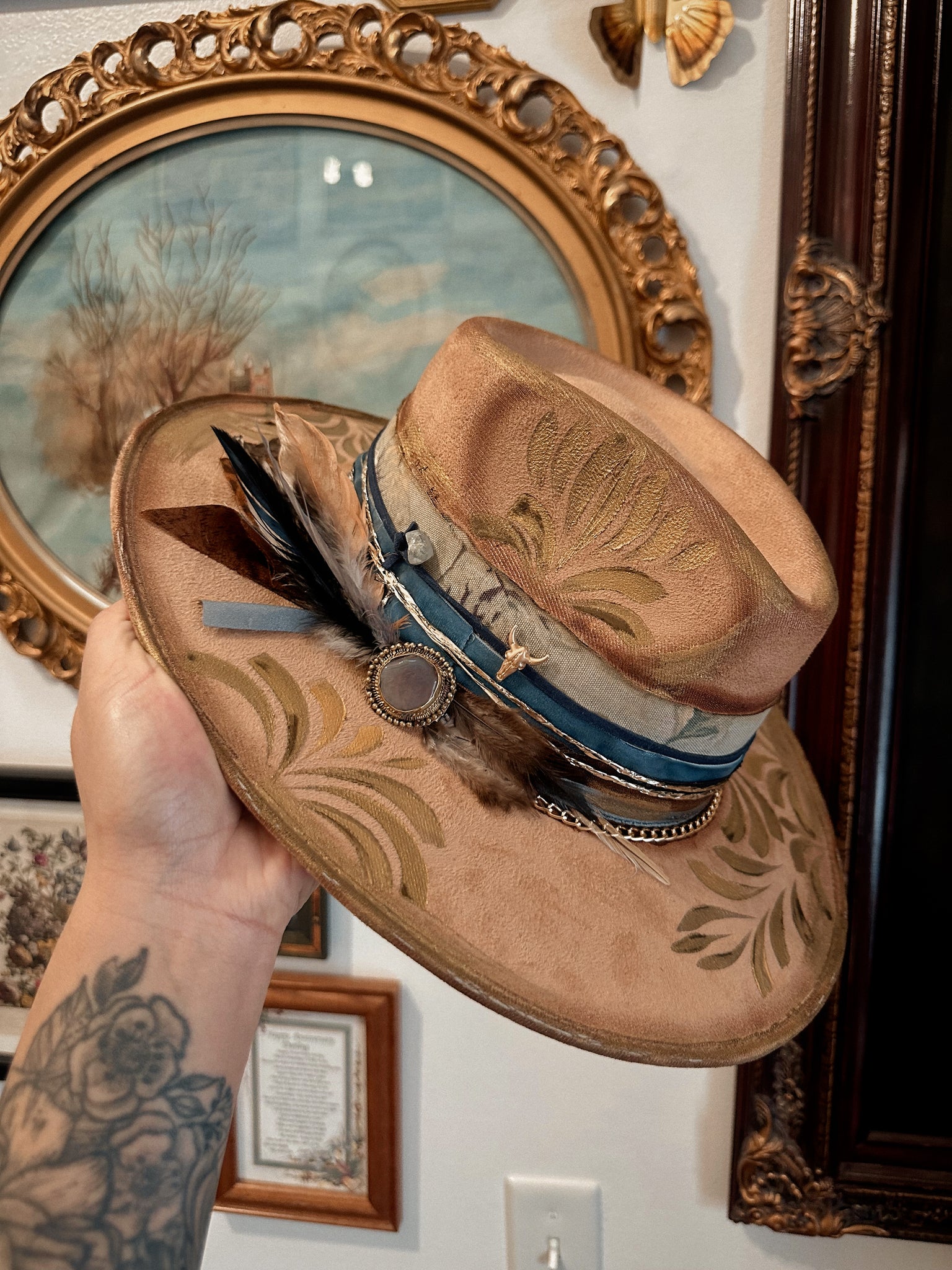 A completely freehand 1 of 1 — hand painted by Yaya in Kansas City and hand crafted hat by skilled artisans.