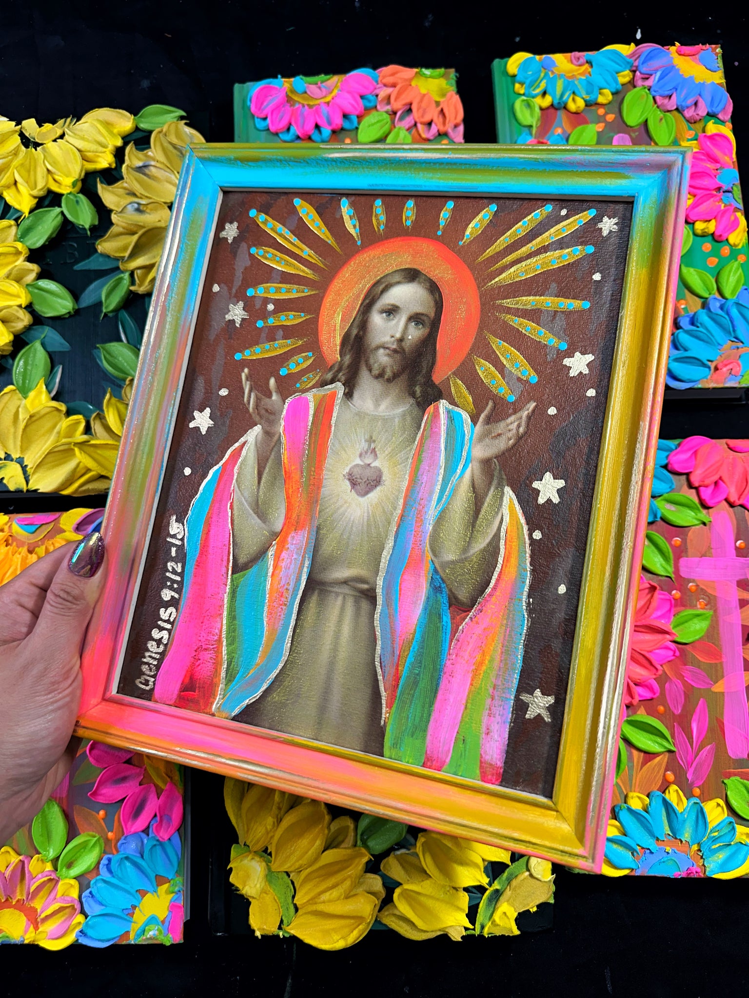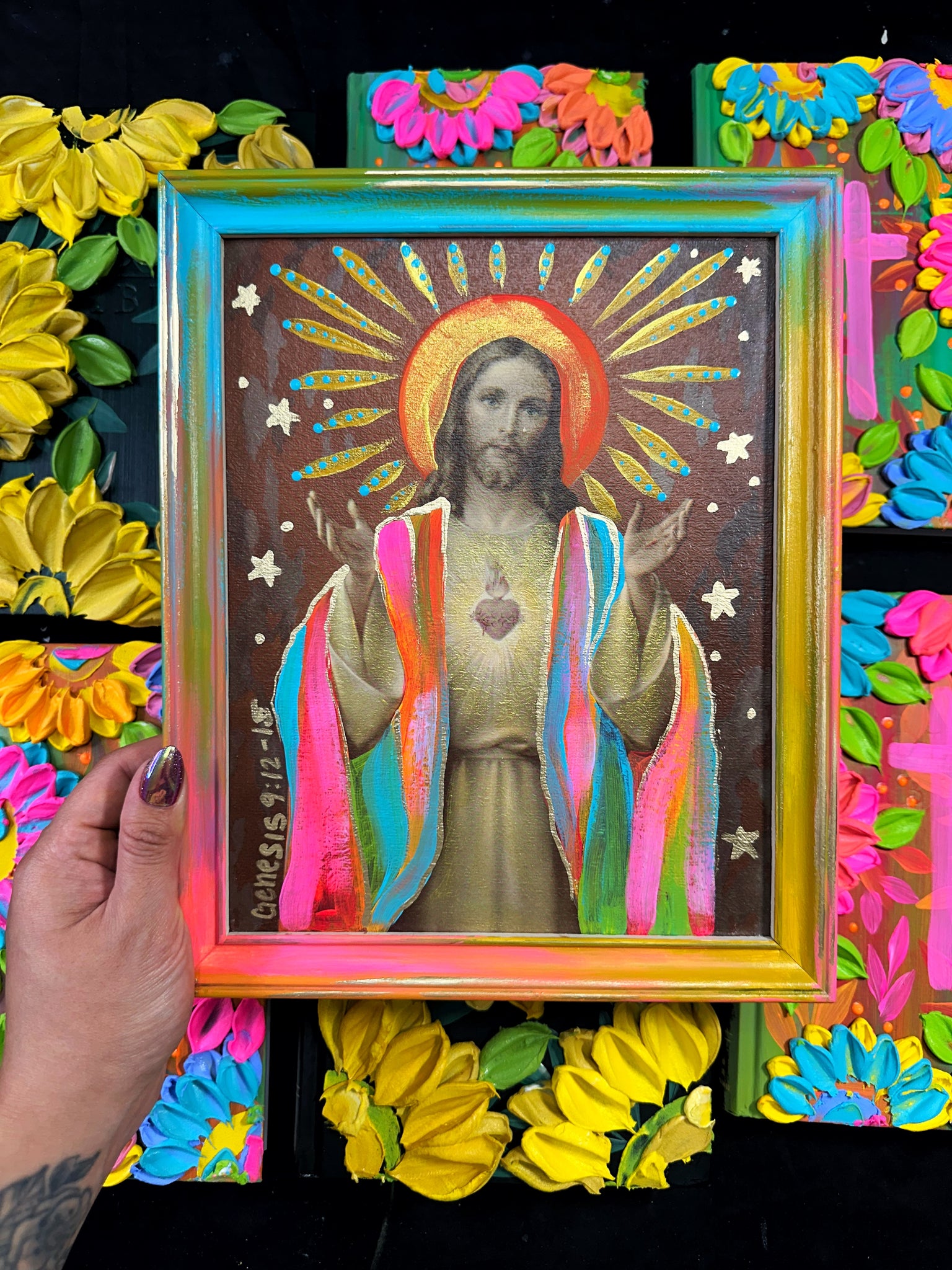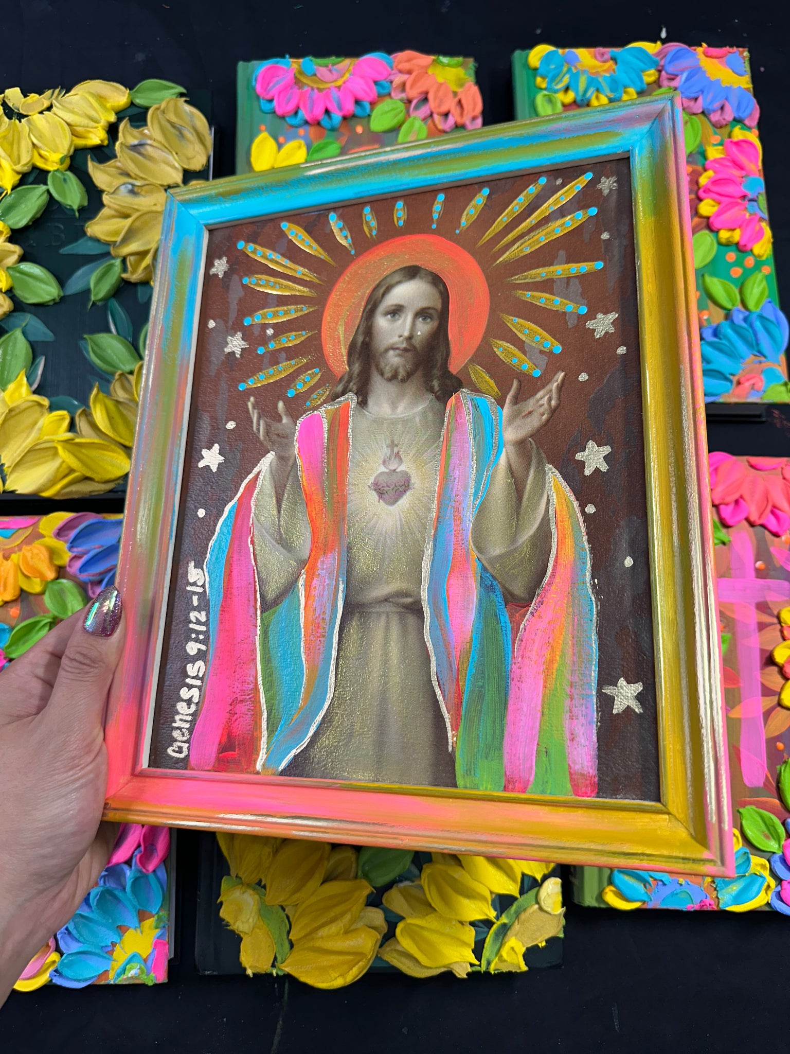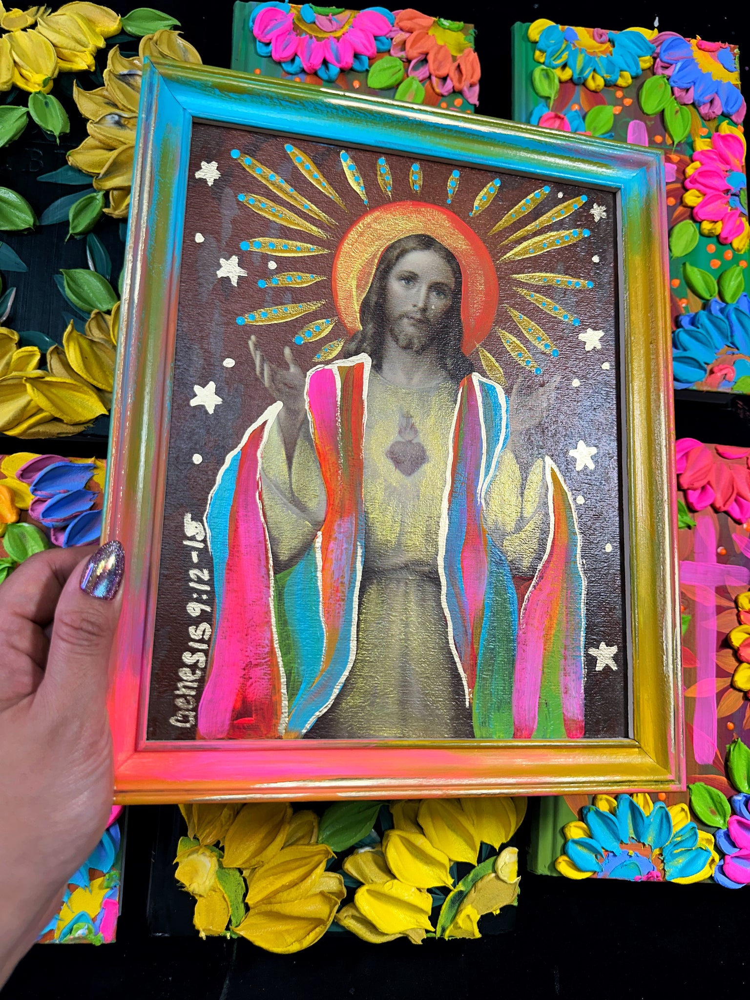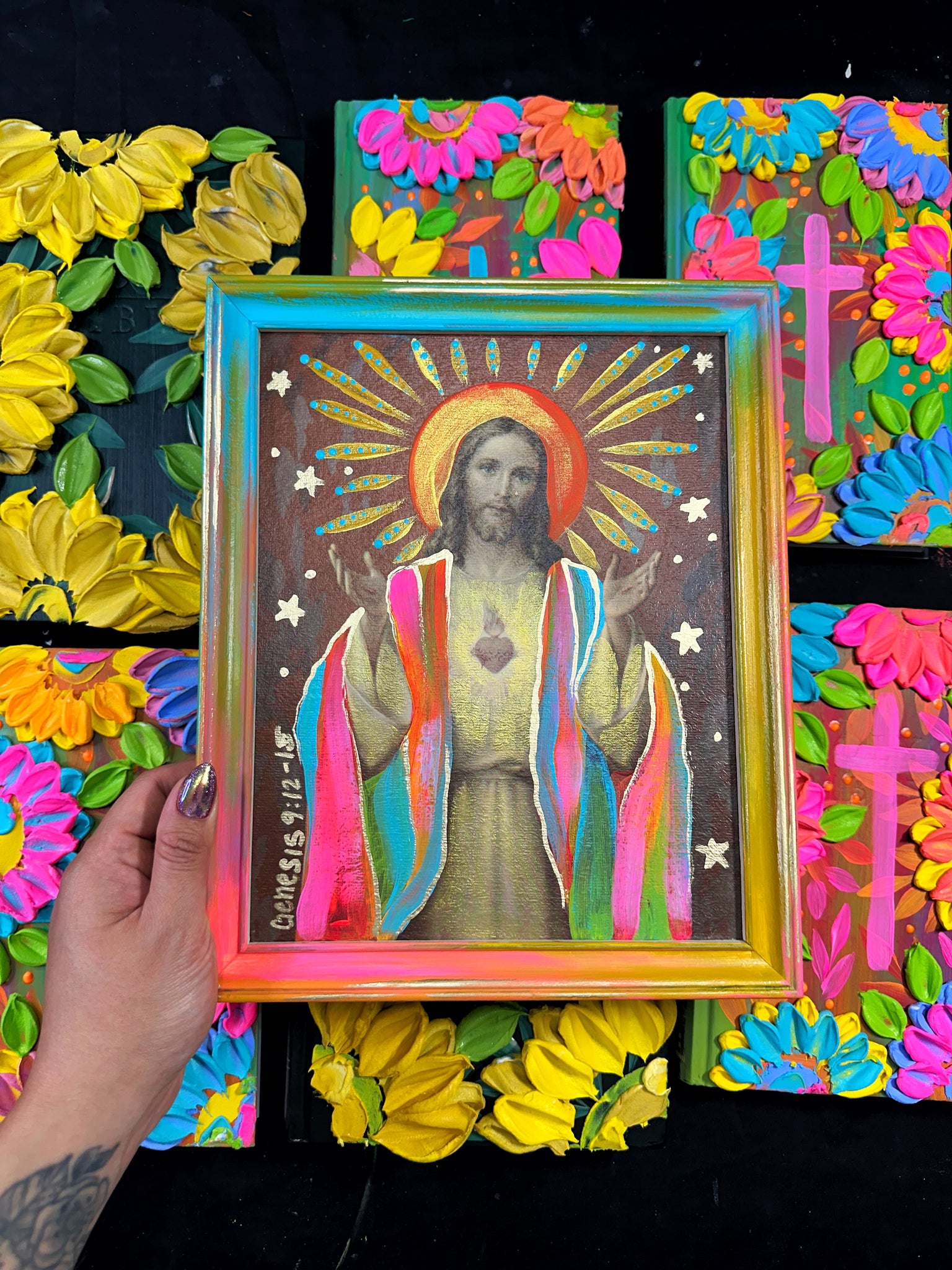 Vibrant rainbow hues dance over the original vintage imagery, highlighted with gold accents that catch the light and bring divine warmth to the piece. Every brushstroke was added with intention, blending reverence and renewal in a way that bridges old and new.
